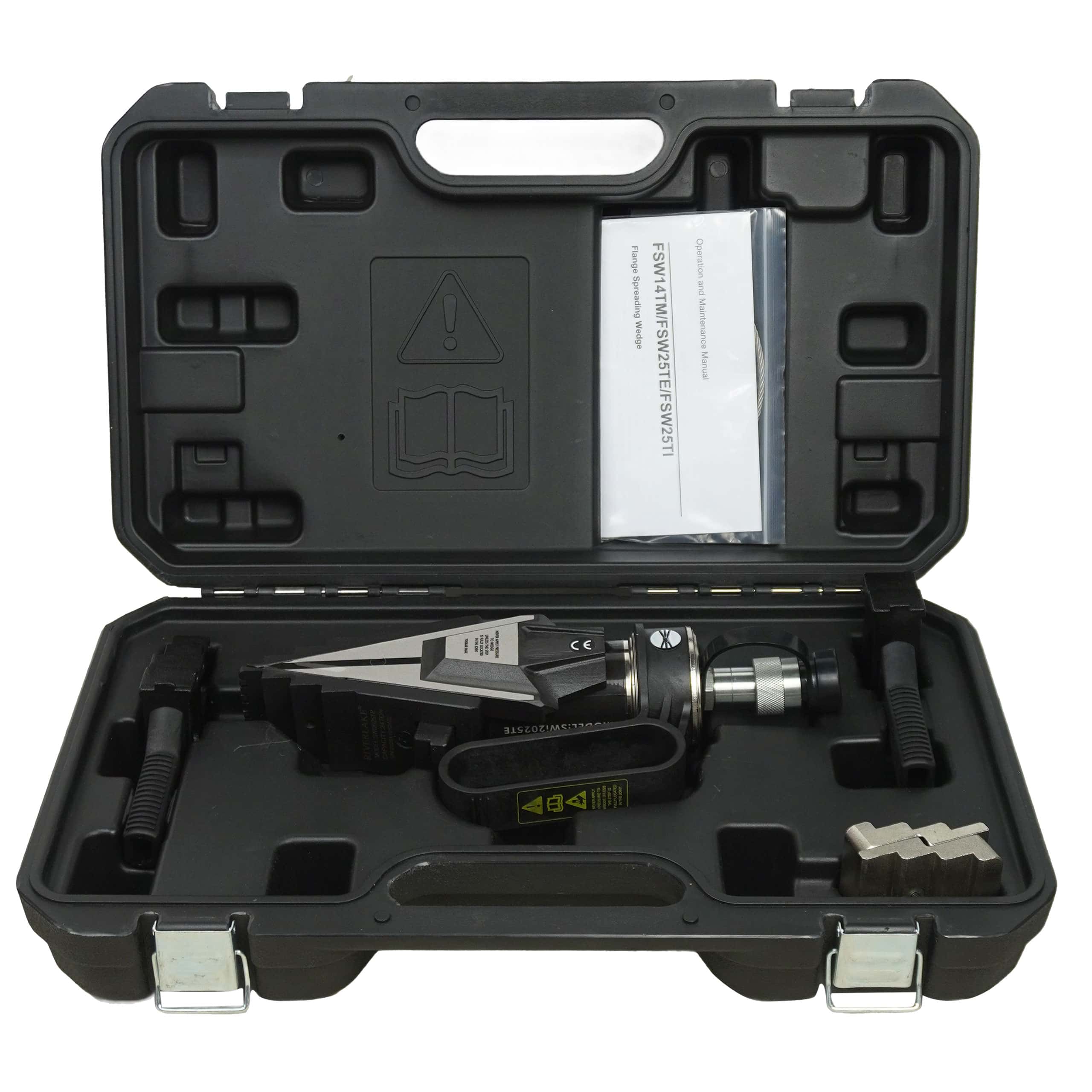 Juego completo para mayor comodidad: El kit SWI2025TE se suministra como un conjunto que incluye el separador de bridas hidráulico, un cordón de seguridad y un maletín de transporte resistente (o un lugar de almacenamiento designado) para mantener los componentes organizados y protegidos durante el transporte. Para su funcionamiento, el kit requiere la conexión a una bomba hidráulica y una manguera independientes (disponibles en RIVERLAKE).