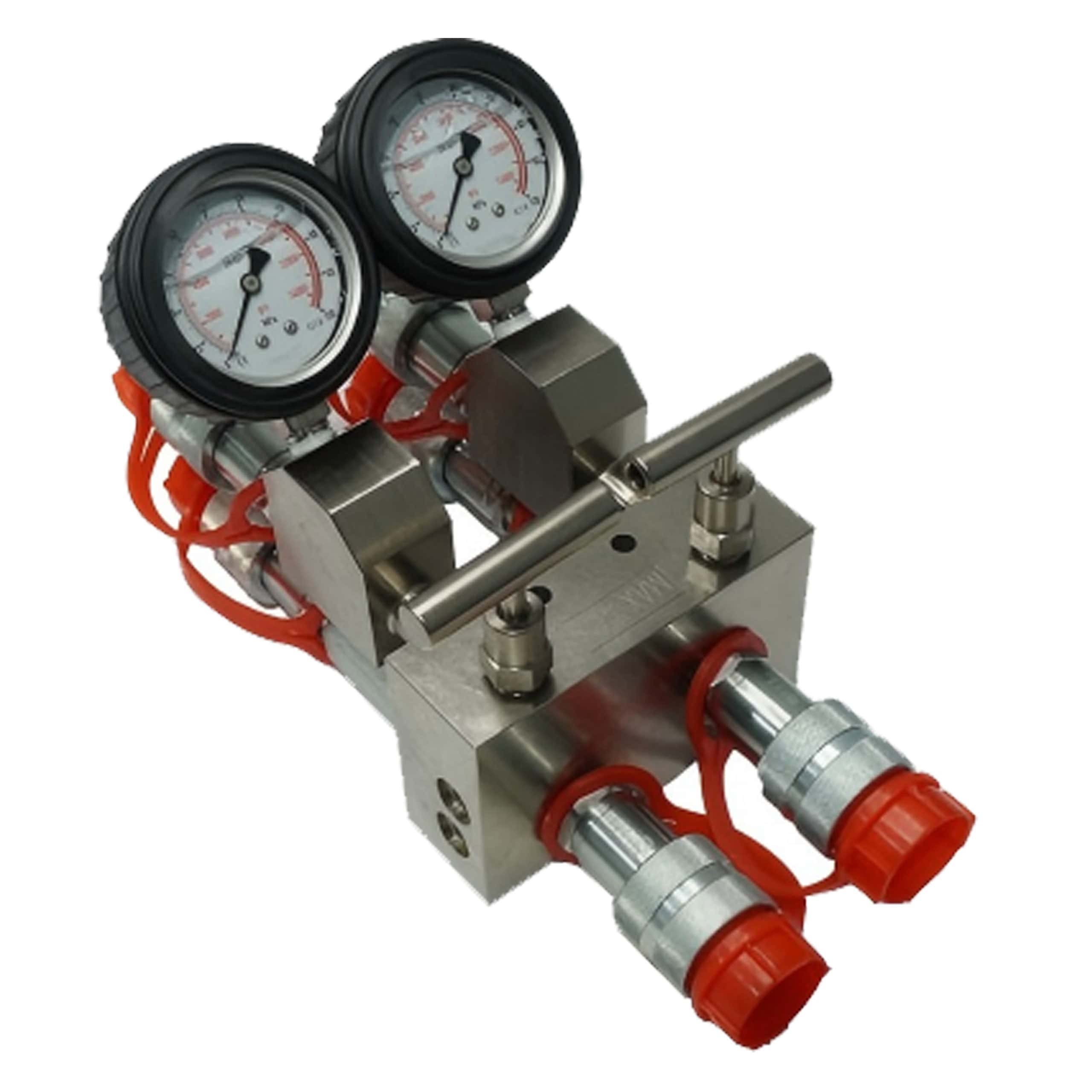 AM22-232-GA,Double Acting,Split Flow Manifold,One Inlet,Two Outlets With Quick Couplers And Pressure Gauges
