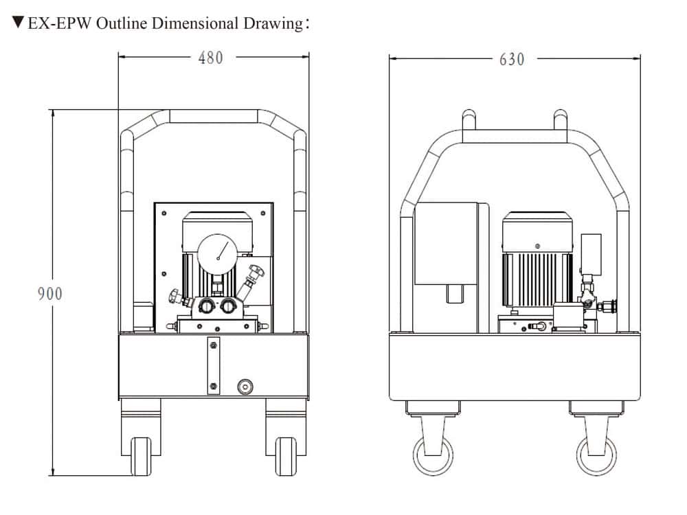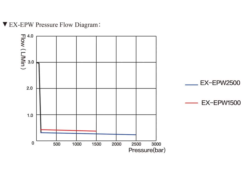 | EX-EPW2500 | 2500 bar | 1.5KW | 3L/Min | 0.35L/Min | 20L | 380VAC | 110kg |