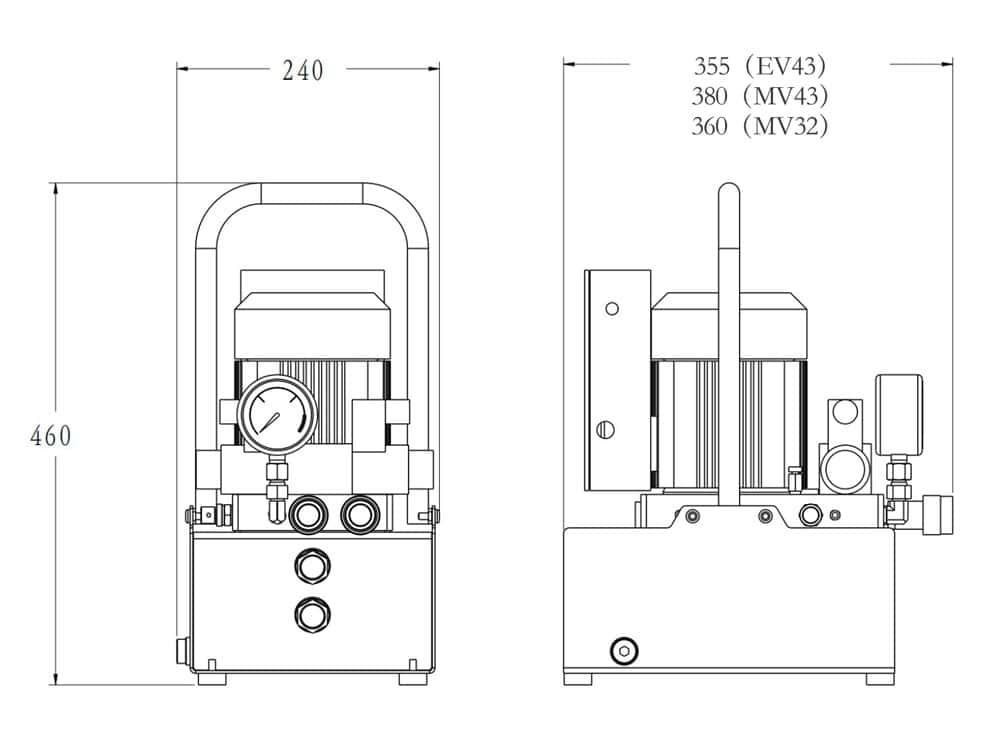 | Model | Max Working Pressure(Mpa) | Motor Power(KW) | Low Pressure Flow Rate(L/min) | High Pressure Flow Rate(L/min) | Voltage | Usable Oil(L) | Control Valve | Oil Outlets | Weight Without Oil(Kg) |