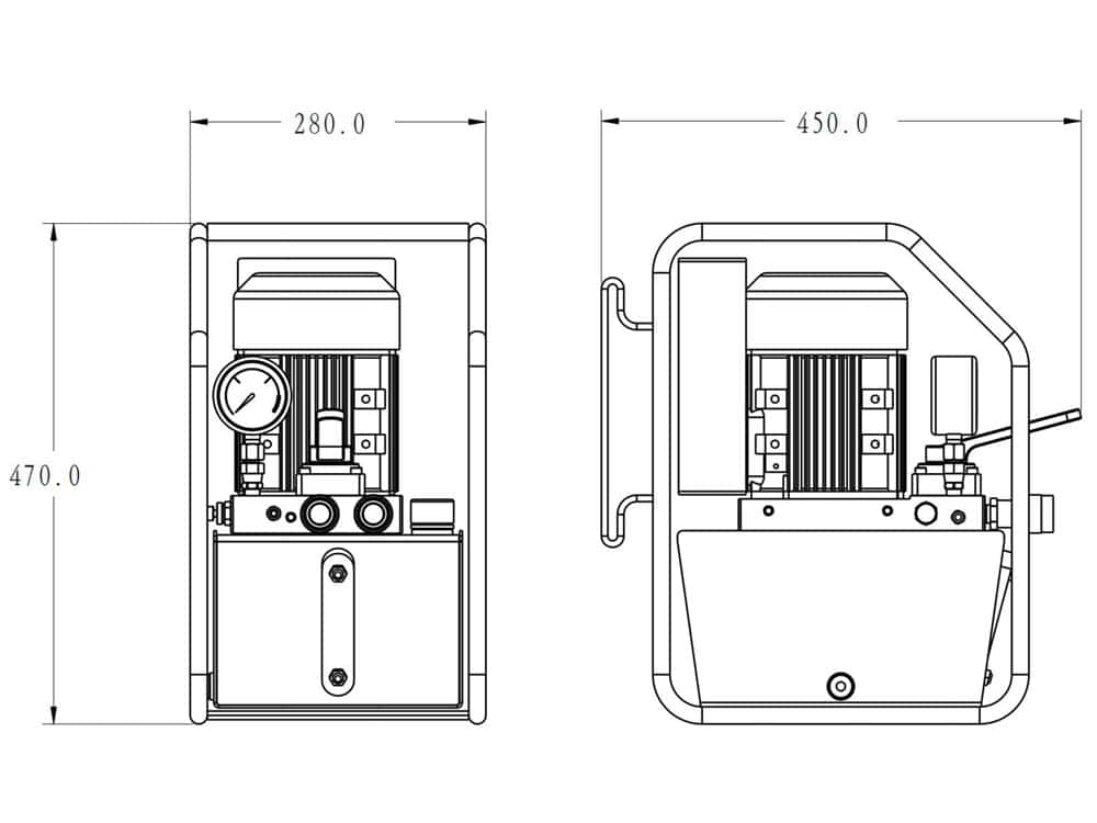 | Model | Max Working Pressure(Mpa) | Motor Power(KW) | Low Pressure Flow Rate(L/min) | High Pressure Flow Rate(L/min) | Voltage | Usable Oil(L) | Control Valve | Oil Outlets | Weight Without Oil(Kg) |