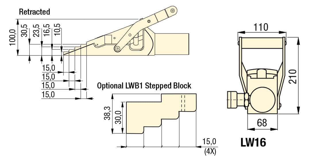 Engineered for Confined Spaces: The LW16 features a minimized access gap, allowing insertion into narrow openings where conventional jacks or wedges cannot fit. Once positioned, hydraulic pressure smoothly extends the wedge to achieve the full 21 mm lift, with no slippage or sudden movement – even under eccentric loads.