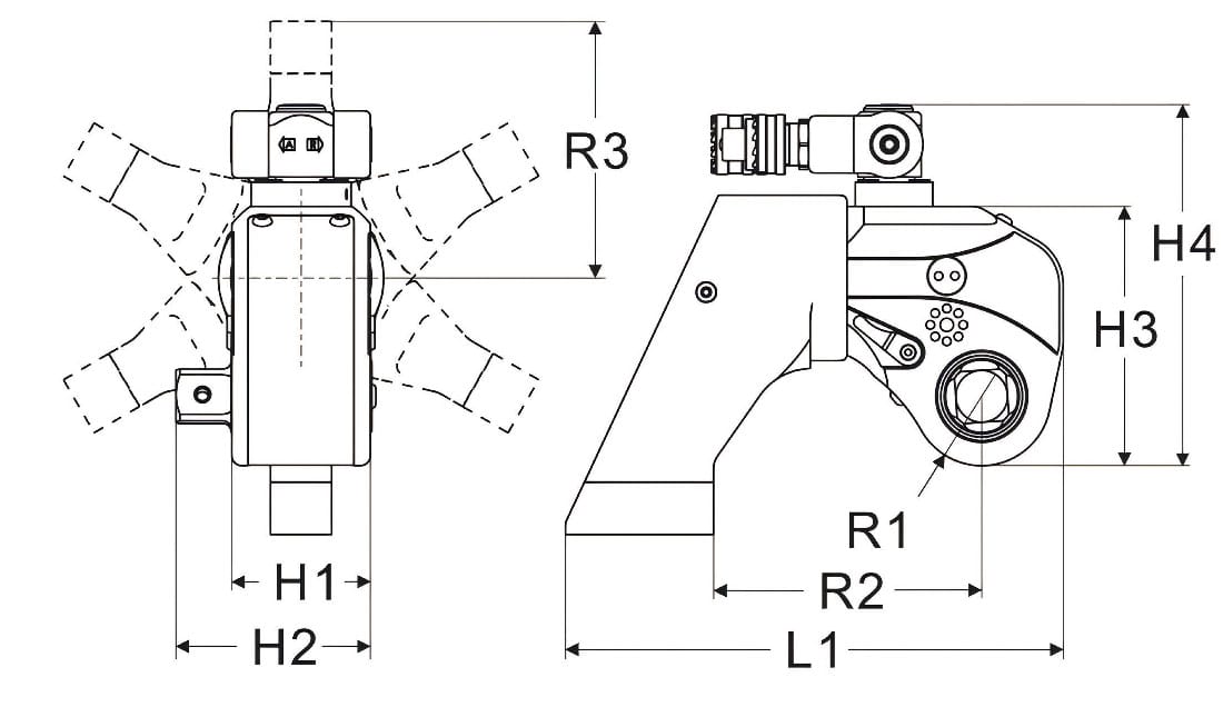 | Torque Wrench Model Number | Torque Range(Nm) | Square Drive Size(inch) | Bolt Range(mm) | Dimension(mm)L1 | Dimension(mm)H1 | Dimension(mm)H2 | Dimension(mm)H3 | Dimension(mm)H4 | Dimension(mm)R1 | Dimension(mm)R2 | Dimension(mm)R3 | Weight(Kg) |